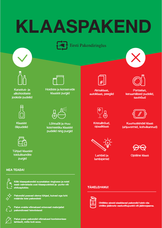 Klaaspakendid peavad olema tühjad, puhtad (vajaduse korral loputatud) ning kuivad. Klaaspakendil olevad sildid võivad külge jääda.